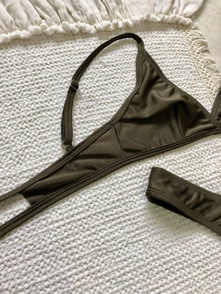 Triángulo fijo forrado, coleta con doble tira para atar en espalda y breteles regulables